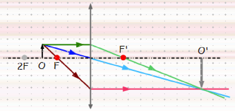 - El raig central: Entra pel vèrtex i (donat que és una lent prima) podem considerar que no hi ha cap desviació.